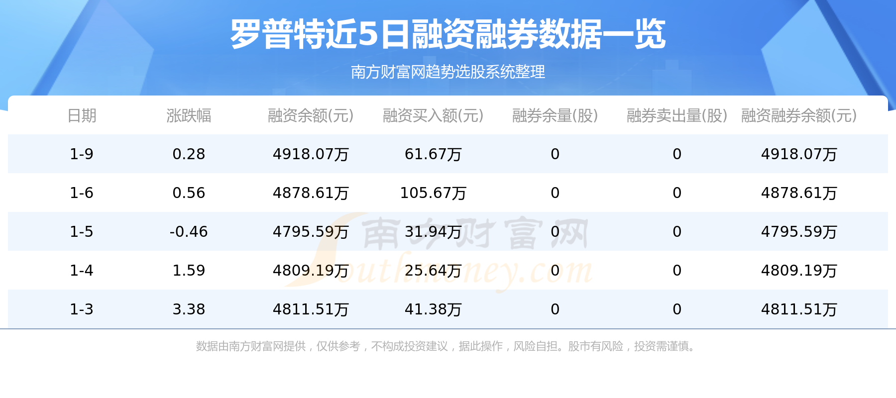 1月9日罗普特融券信息显示,融资方面,当日融资买入61.67万元,融资偿还22.22万元,融资净买额39.46万元。近5日融资融券数据一览见下表: