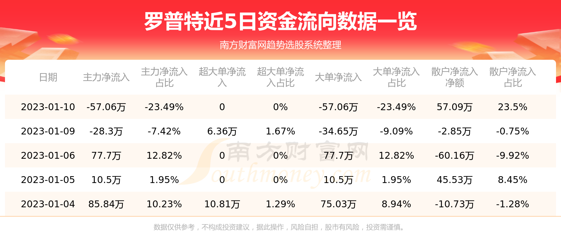 1月10日消息,罗普特1月10日主力净流出57.06万元,大单净流出57.06万元,散户净流入57.09万元。