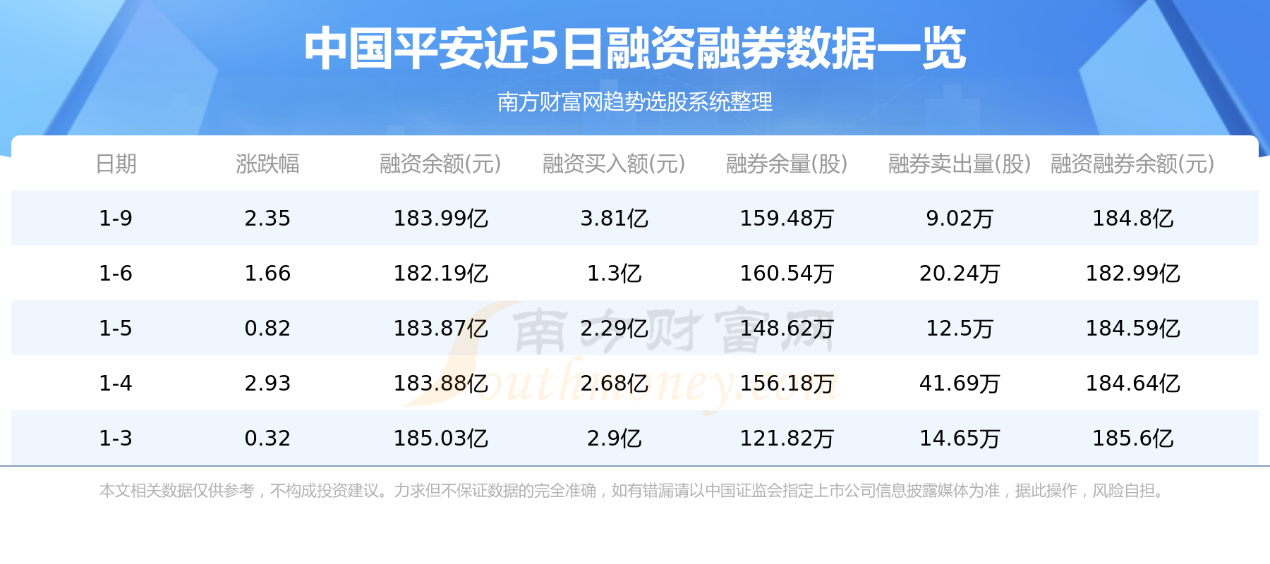 1月9日中国平安融券信息显示,融资方面,当日融资买入3.81亿元,融资偿还2.01亿元,融资净买额1.8亿元。融券方面,融券卖出9.02万股,融券偿还10.08万股,融券余量159.48万股,融券余额8119.13万元。融资融券余额184.8亿元。