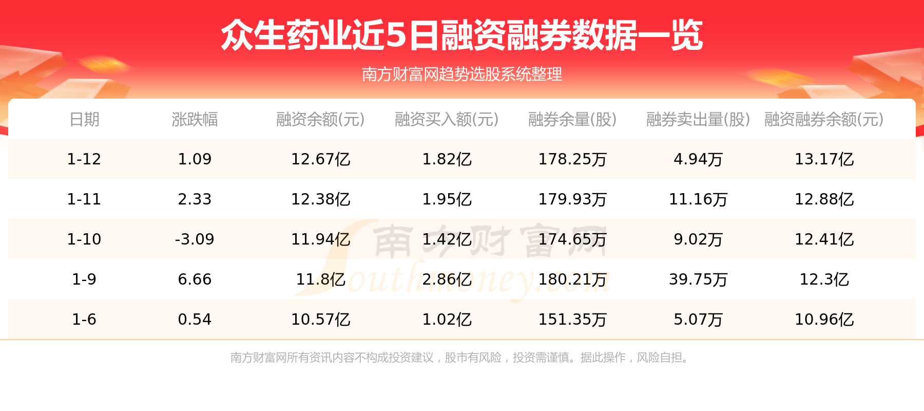 1月12日众生药业融券信息显示,融资方面,当日融资买入1.82亿元,融资偿还1.53亿元,融资净买额2882.77万元。融券方面,融券卖出4.94万股,融券偿还6.63万股,融券余量178.25万股,融券余额4978.41万元。融资融券余额13.17亿元。近5日融资融券数据一览见下表: