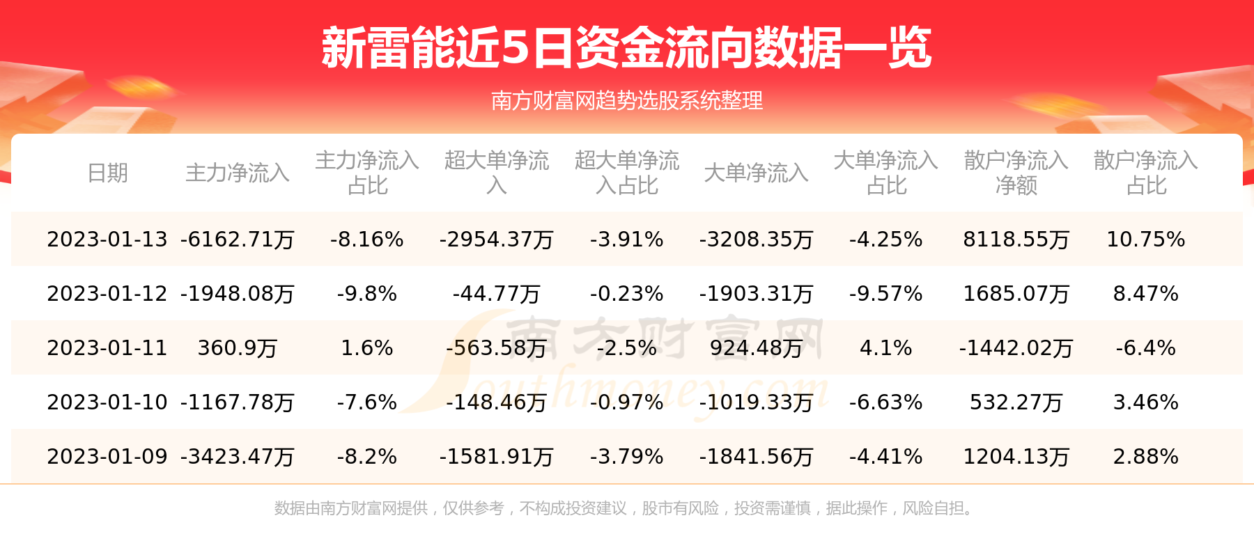 1月13日消息,新雷能主力净流出6162.71万元,超大单净流出2954.37万元,散户净流入8118.55万元。