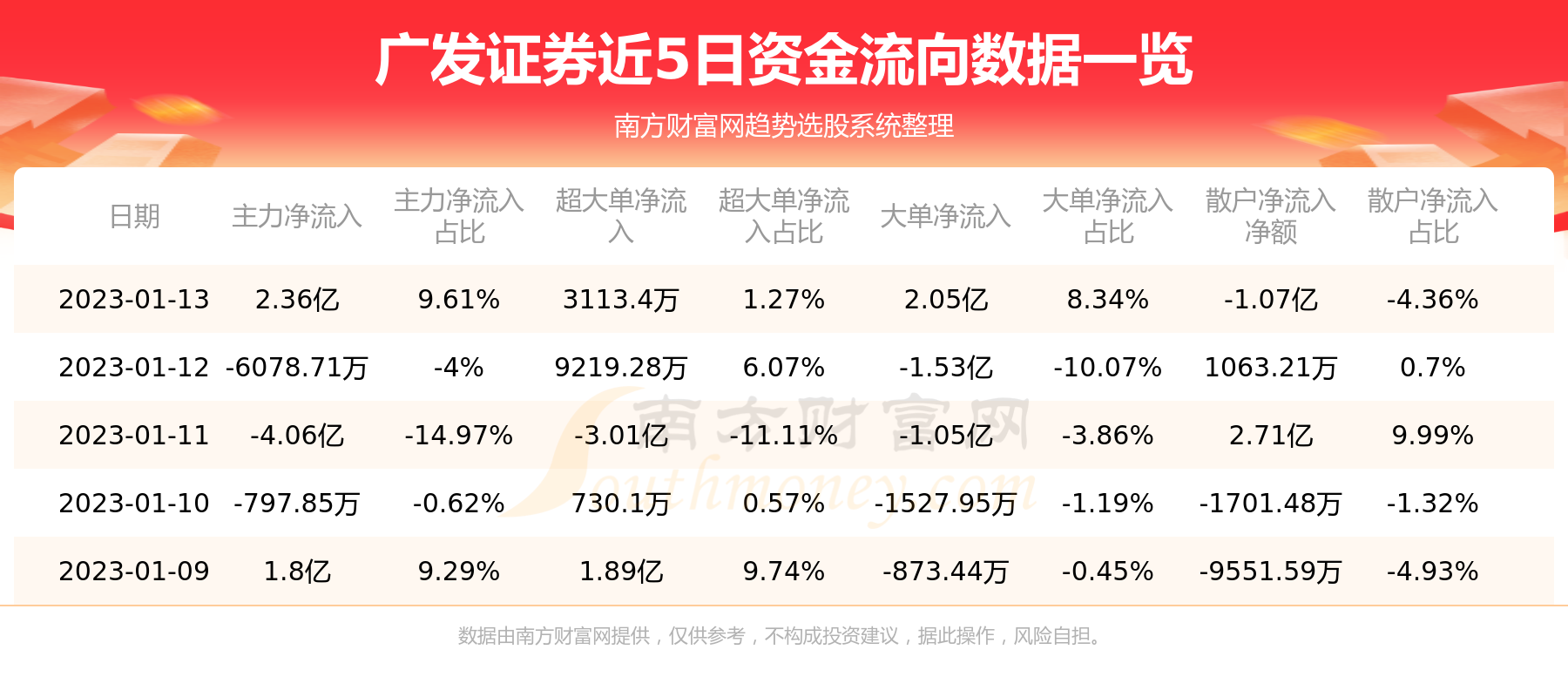 1月13日消息,广发证券资金净流入2.36亿元,超大单资金净流入3113.4万元,换手率4.84%,成交金额21.47亿元。