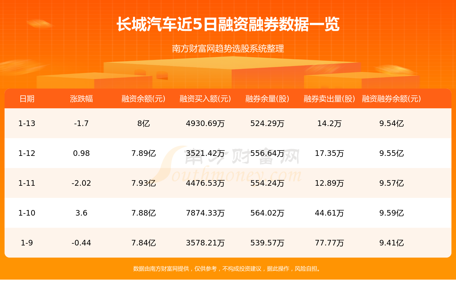 1月13日长城汽车融券信息显示,融资方面,当日融资买入4930.69万元,融资偿还3813.02万元,融资净买额1117.68万元。融券方面,融券卖出14.2万股,融券偿还46.55万股,融券余量524.29万股,融券余额1.54亿元。融资融券余额9.54亿元。近5日融资融券数据一览见下表: