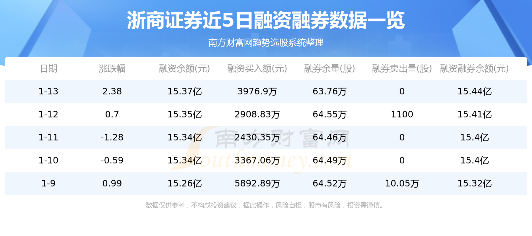 浙商证券1月13日融券信息显示,融资方面,当日融资买入3976.9万元,融资偿还3733.75万元,融资净买额243.15万元。近5日融资融券数据一览见下表: