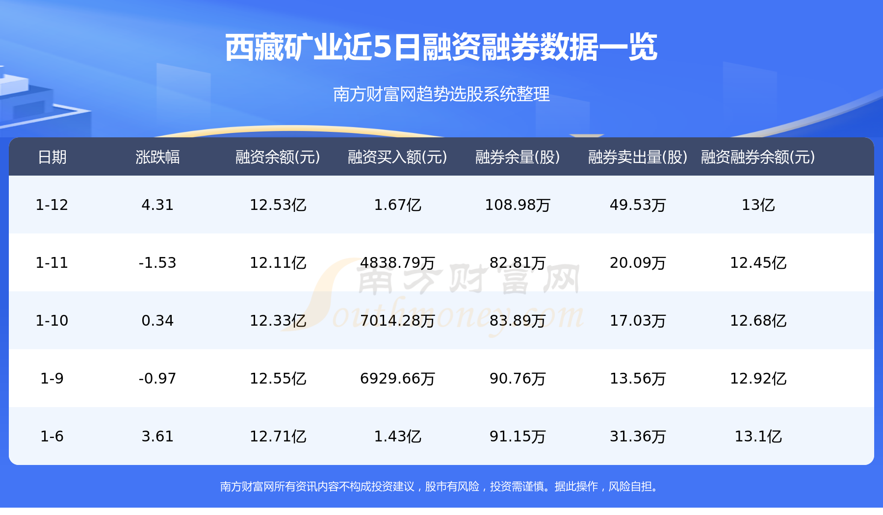 1月12日西藏矿业融券信息显示,融资方面,当日融资买入1.67亿元,融资偿还1.25亿元,融资净买额4194.86万元。融券方面,融券卖出49.53万股,融券偿还23.36万股,融券余量108.98万股,融券余额4691.74万元。融资融券余额13亿元。近5日融资融券数据一览见下表: