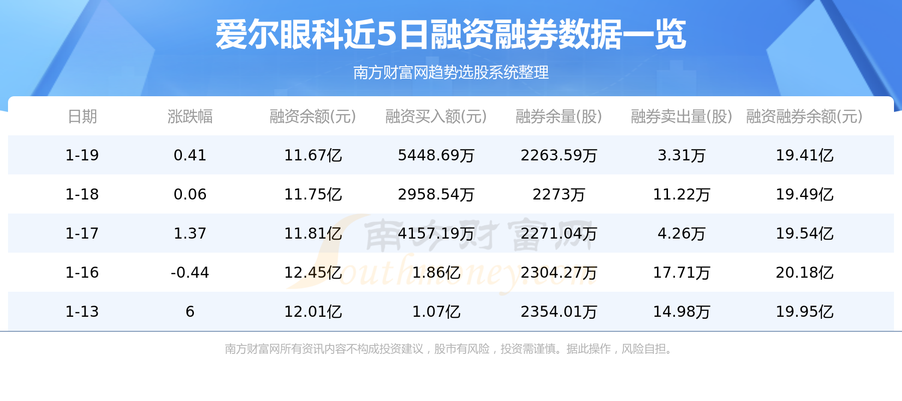 爱尔眼科1月19日融券信息显示,融资方面,当日融资买入5448.69万元,融资偿还6189.03万元,融资净买额-740.34万元。融券方面,融券卖出3.31万股,融券偿还12.72万股,融券余量2263.59万股,融券余额7.74亿元。融资融券余额19.41亿元。近5日融资融券数据一览见下表: