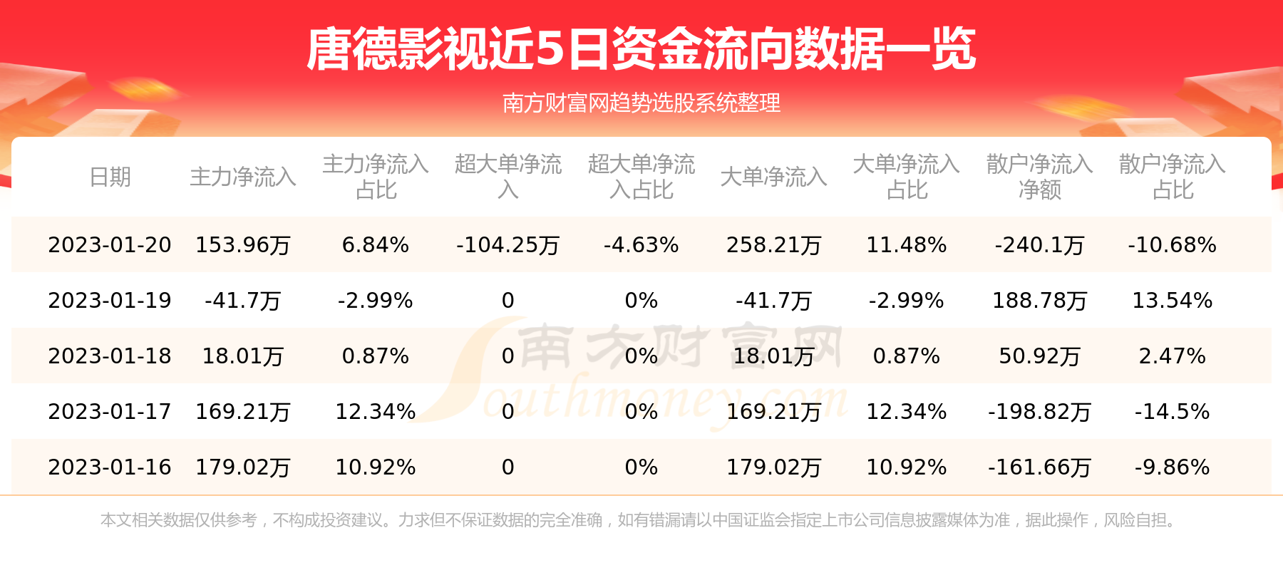 1月20日消息,唐德影视主力资金净流入153.96万元,超大单资金净流出104.25万元,散户资金净流出240.1万元。