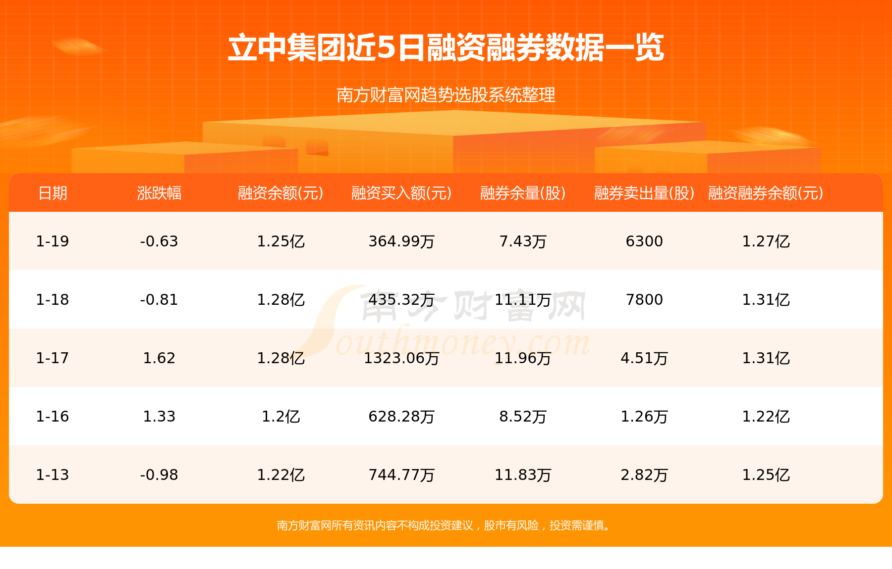立中集团1月19日融券信息显示,融资方面,当日融资买入364.99万元,融资偿还584.42万元,融资净买额-219.43万元。融券方面,融券卖出6300股,融券偿还4.31万股,融券余量7.43万股,融券余额198.19万元。融资融券余额1.27亿元。近5日融资融券数据一览见下表:
