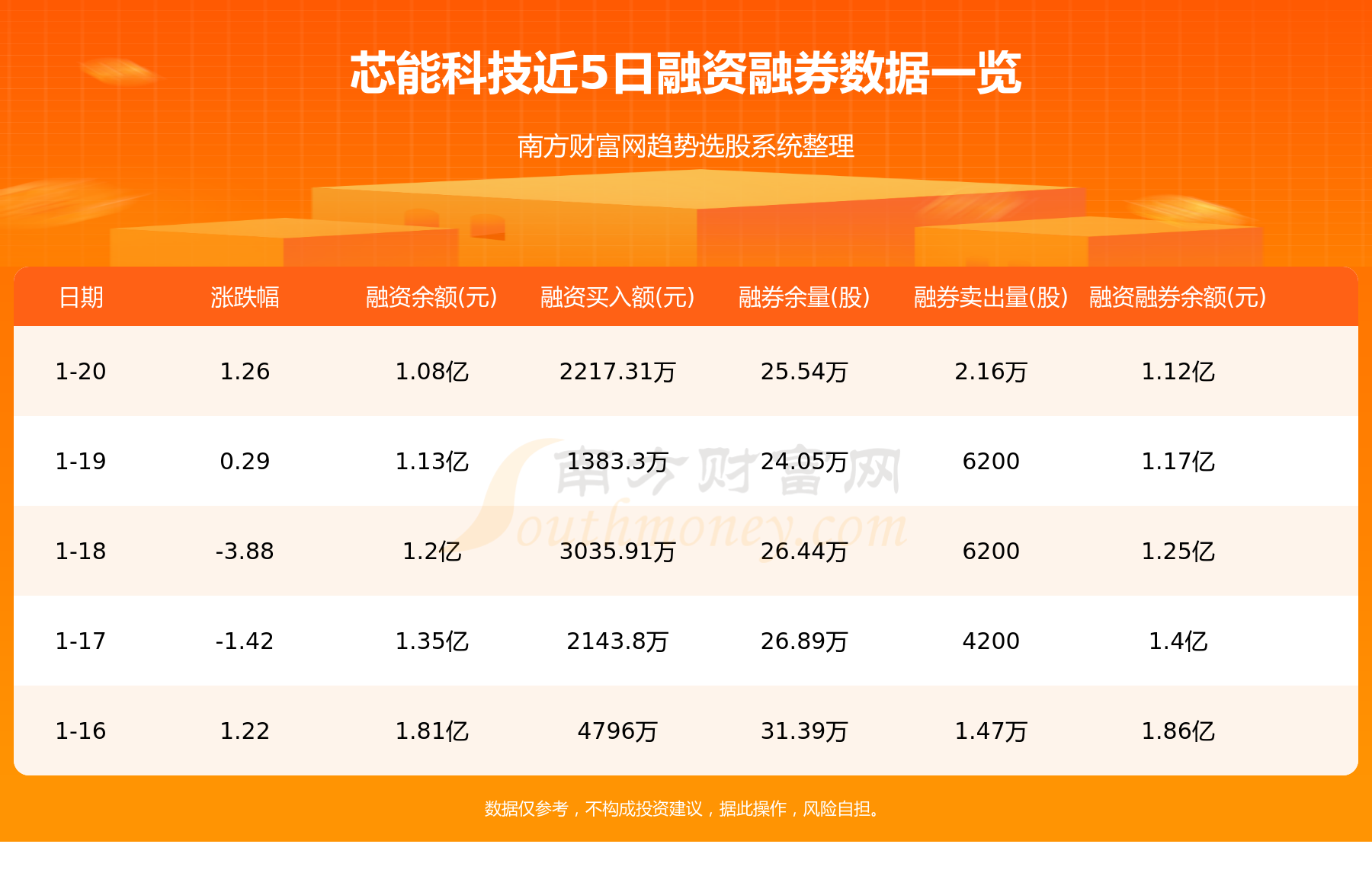 芯能科技1月20日融券信息显示,融资方面,当日融资买入2217.31万元,融资偿还2787.22万元,融资净买额-569.9万元。融券方面,融券卖出2.16万股,融券偿还6700股,融券余量25.54万股,融券余额450.3万元。融资融券余额1.12亿元。近5日融资融券数据一览见下表: