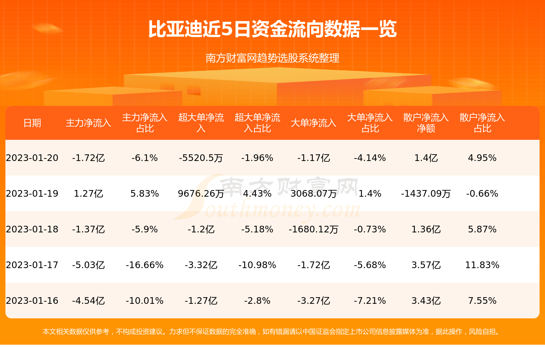1月20日消息,比亚迪主力净流出1.72亿元,超大单净流出5520.5万元,散户净流入1.4亿元。
