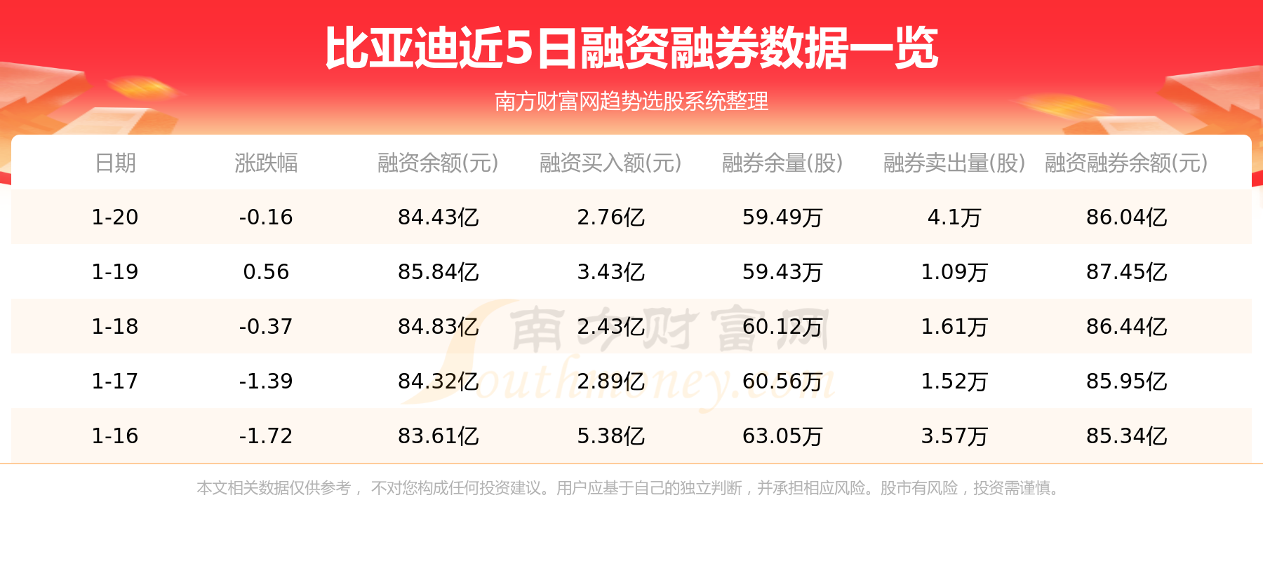 1月20日比亚迪融券信息显示,融资方面,当日融资买入2.76亿元,融资偿还4.17亿元,融资净买额-1.4亿元。融券方面,融券卖出4.1万股,融券偿还4.04万股,融券余量59.49万股,融券余额1.61亿元。融资融券余额86.04亿元。近5日融资融券数据一览见下表: