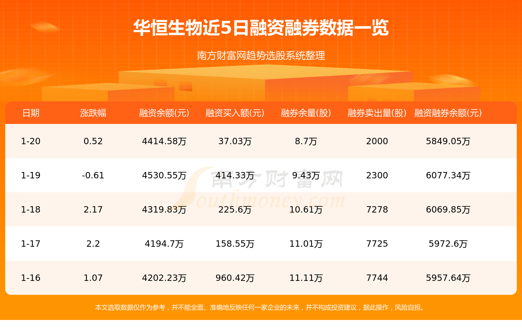 华恒生物1月20日融券信息显示,融资方面,当日融资买入37.03万元,融资偿还153.01万元,融资净买额-115.97万元。融券方面,融券卖出2000股,融券偿还9300股,融券余量8.7万股,融券余额1434.47万元。融资融券余额5849.05万元。近5日融资融券数据一览见下表: