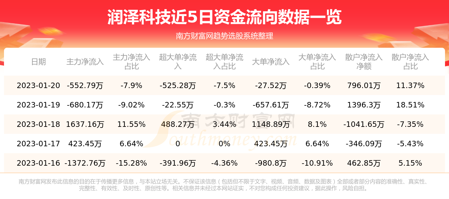 1月20日消息,润泽科技主力资金净流出552.79万元,超大单资金净流出525.28万元,散户资金净流入796.01万元。