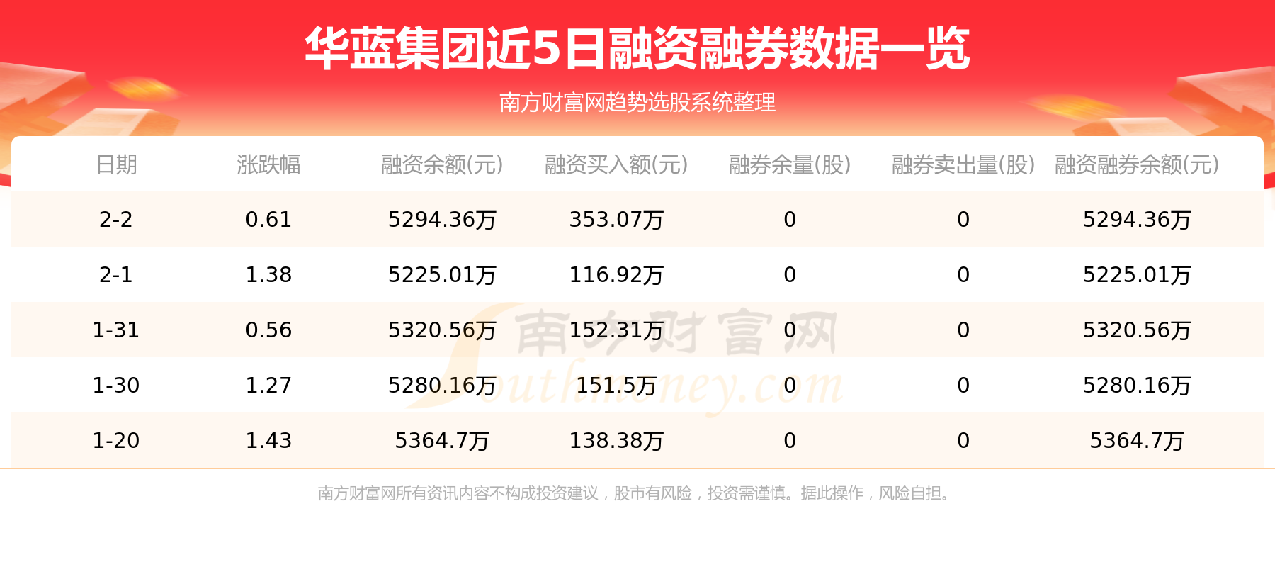 华蓝集团2月2日融券信息显示,融资方面,当日融资买入353.07万元,融资偿还283.73万元,融资净买额69.34万元。近5日融资融券数据一览见下表: