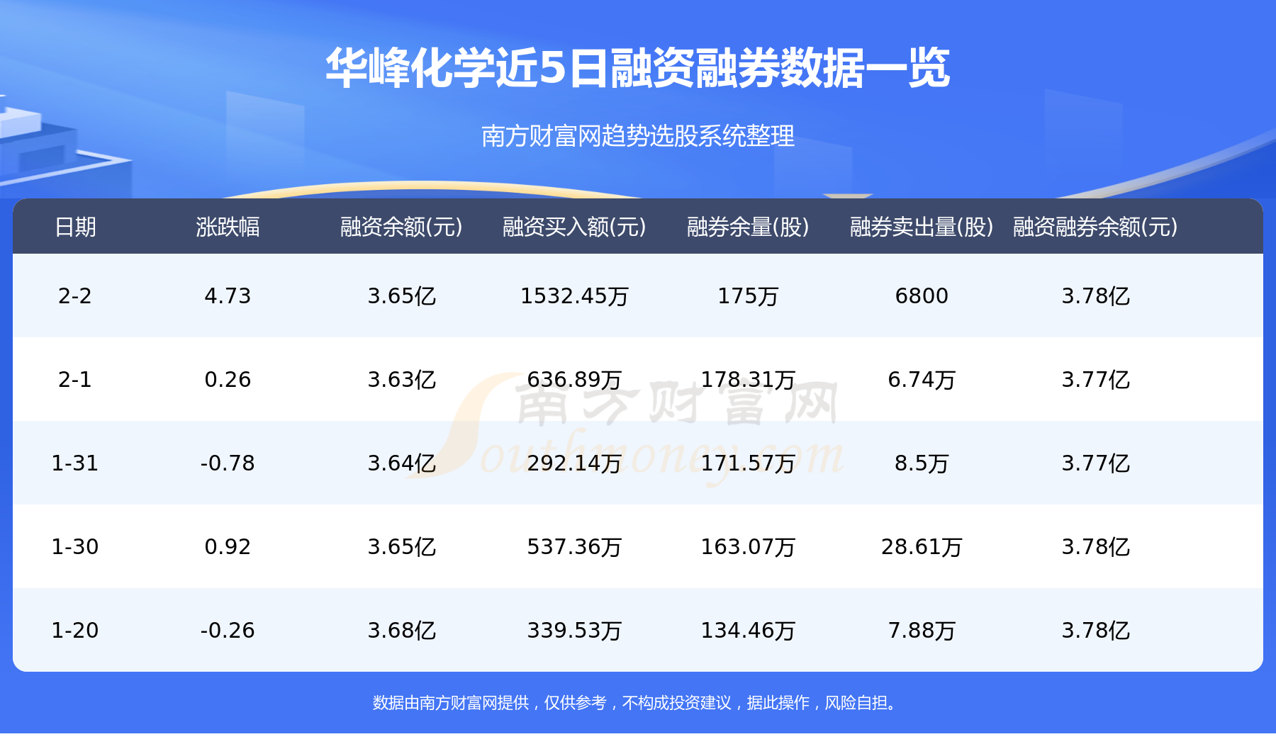 2月2日华峰化学融券信息显示,融资方面,当日融资买入1532.45万元,融资偿还1387.6万元,融资净买额144.85万元。融券方面,融券卖出6800股,融券偿还4万股,融券余量175万股,融券余额1394.74万元。融资融券余额3.78亿元。近5日融资融券数据一览见下表:
