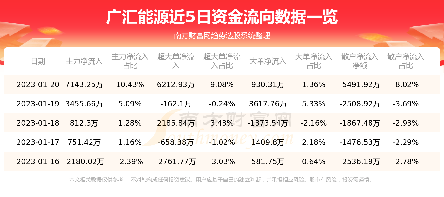 1月20日消息,广汇能源1月20日主力资金净流入7143.25万元,超大单资金净流入6212.93万元,大单资金净流入930.31万元,散户资金净流出5491.92万元。