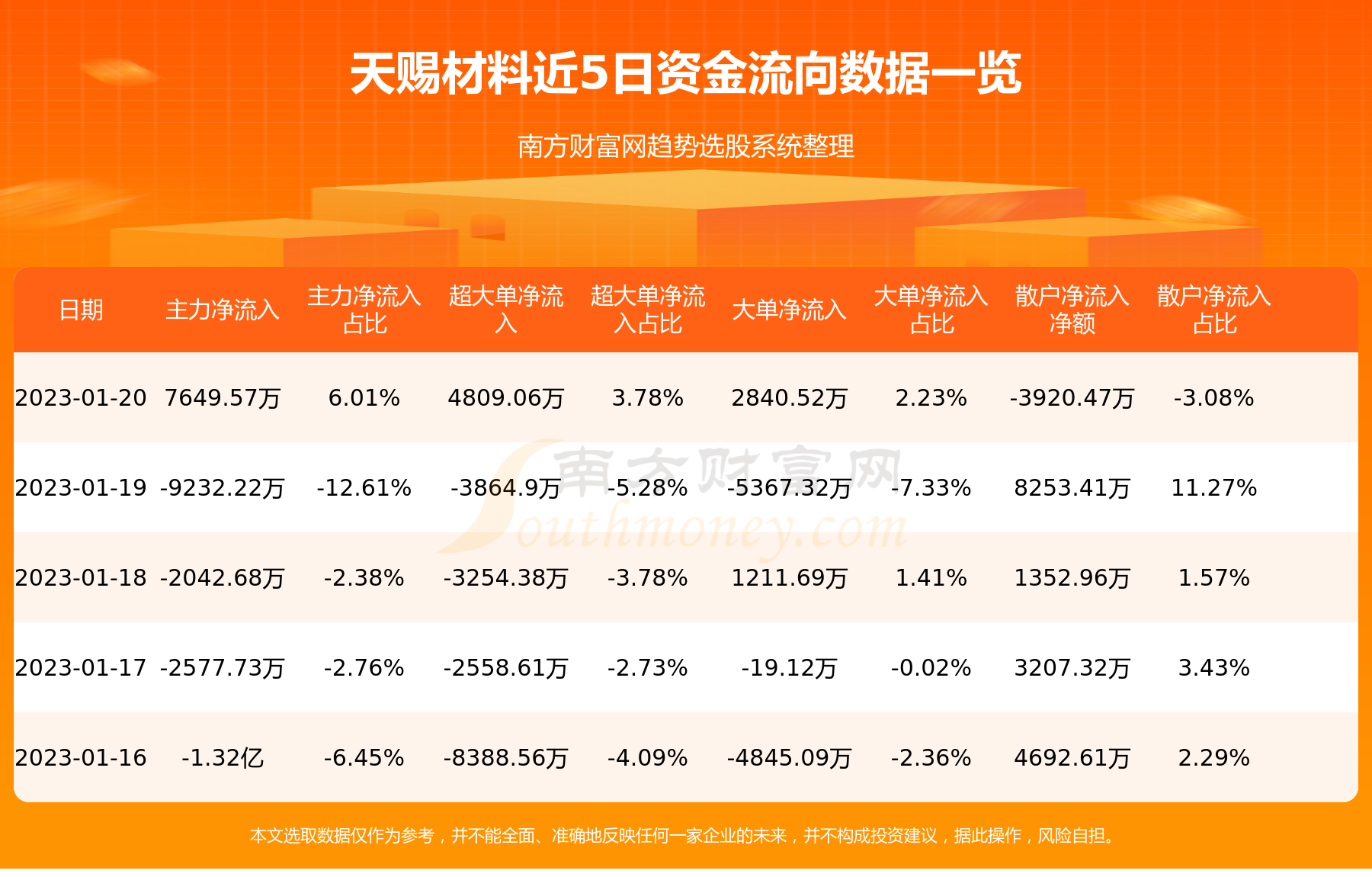1月20日消息,天赐材料资金净流入7649.57万元,超大单净流入4809.06万元,换手率1.13%,成交金额7.39亿元。