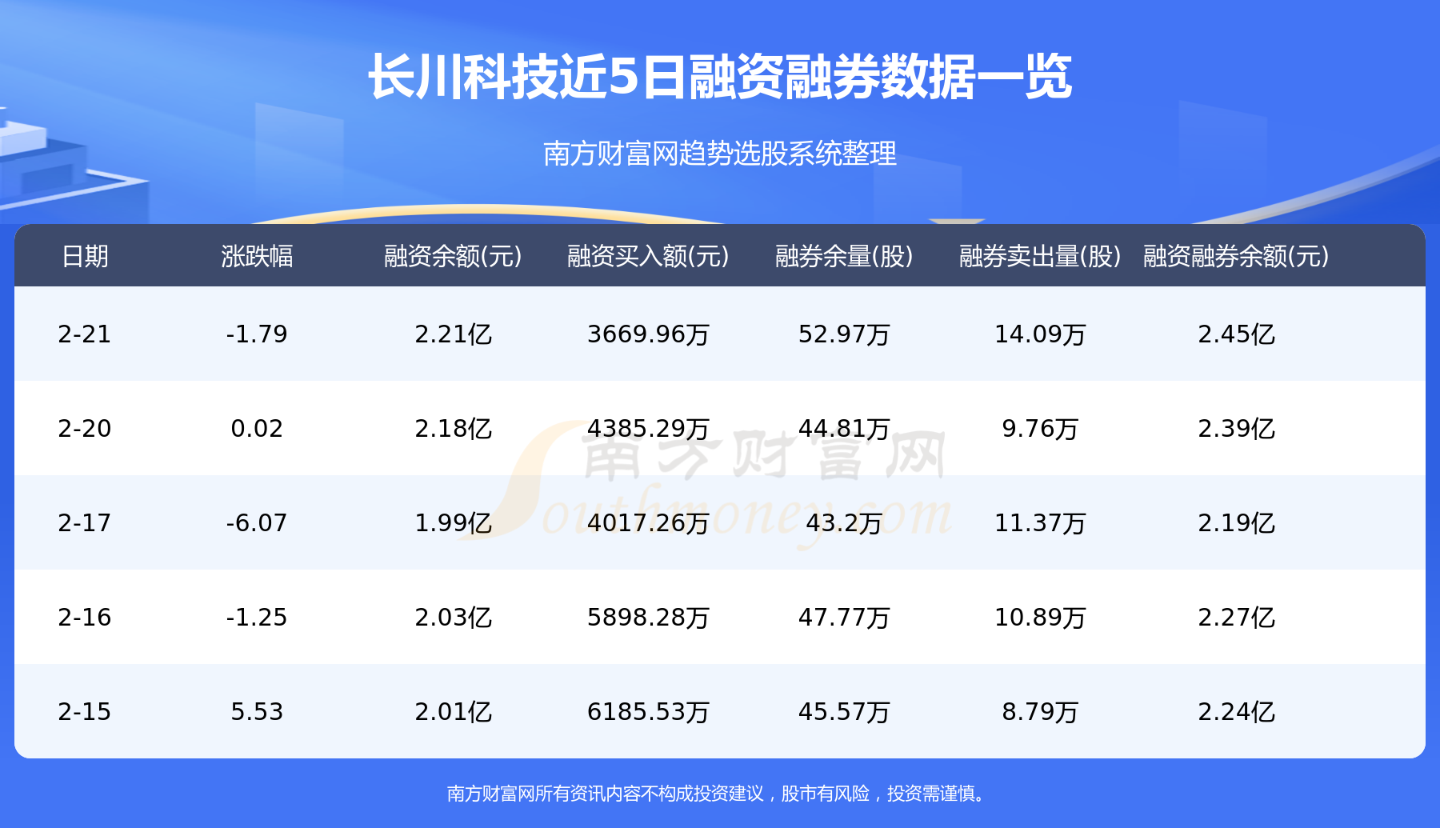 长川科技2月21日融券信息显示,融资方面,当日融资买入3669.96万元,融资偿还3430.95万元,融资净买额239.01万元。融券方面,融券卖出14.09万股,融券偿还5.93万股,融券余量52.97万股,融券余额2441.26万元。融资融券余额2.45亿元。