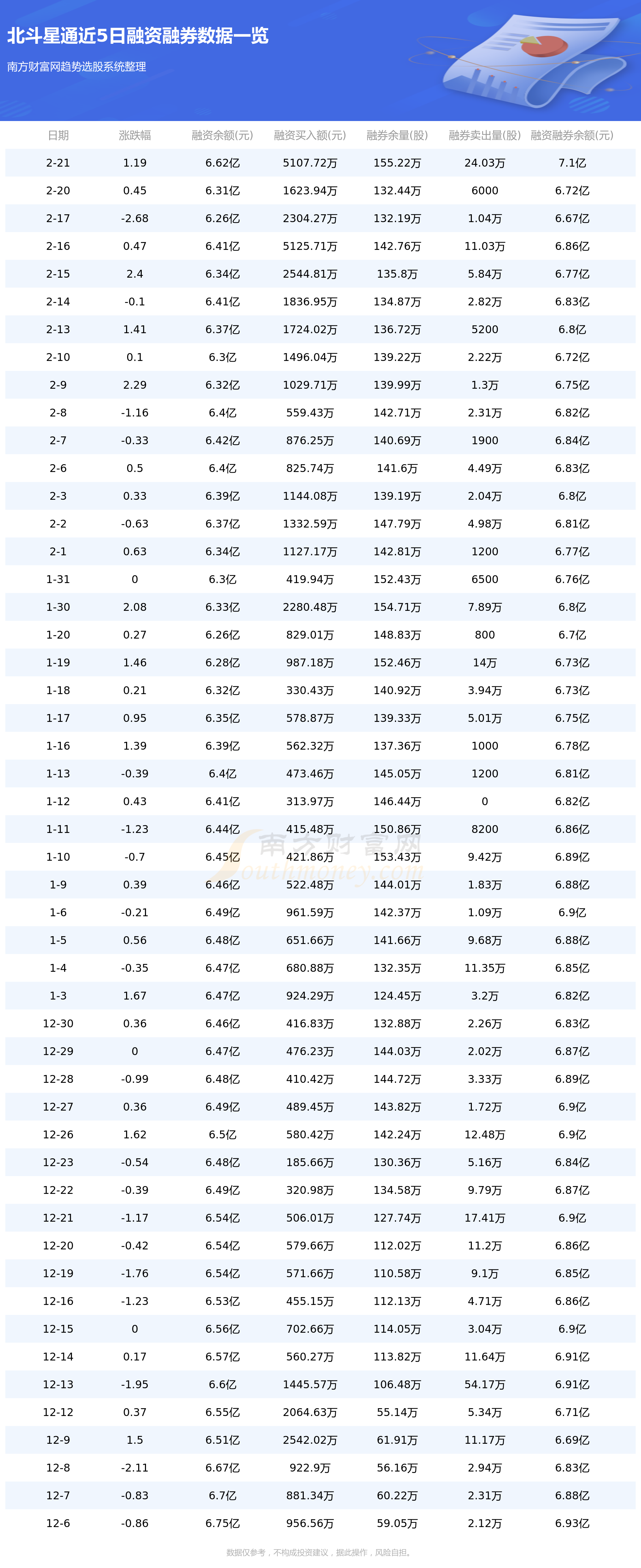2月21日北斗星通融券信息显示,融资方面,当日融资买入5107.72万元,融资偿还1997.92万元,融资净买额3109.8万元。融券方面,融券卖出24.03万股,融券偿还1.25万股,融券余量155.22万股,融券余额4875.33万元。融资融券余额7.1亿元。近5日融资融券数据一览见下表: