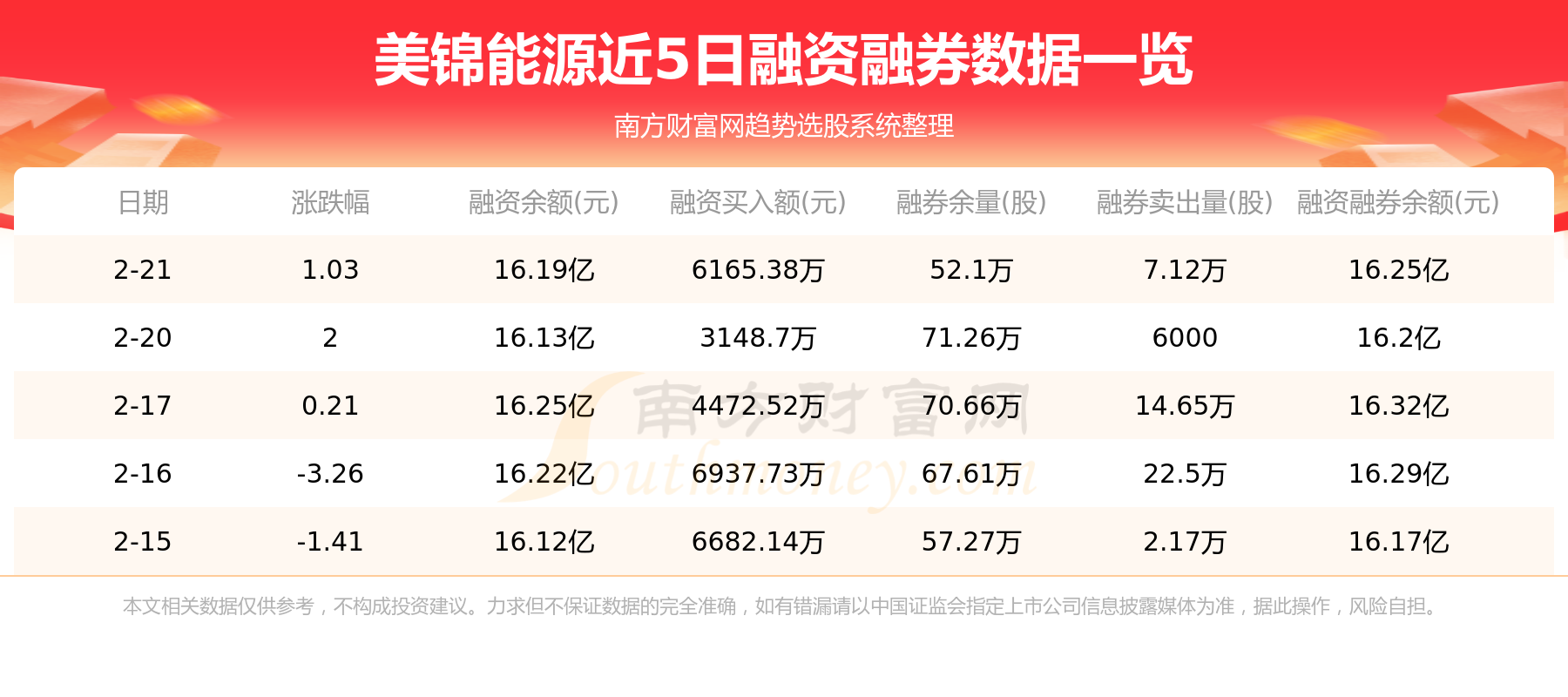 美锦能源2月21日融券信息显示,融资方面,当日融资买入6165.38万元,融资偿还5506.34万元,融资净买额659.04万元。融券方面,融券卖出7.12万股,融券偿还26.28万股,融券余量52.1万股,融券余额510.56万元。融资融券余额16.25亿元。近5日融资融券数据一览见下表: