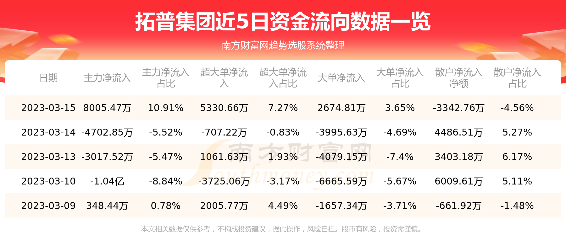 3月15日消息,拓普集团资金净流入8005.47万元,超大单资金净流入5330.66万元,换手率1.19%,成交金额7.34亿元。