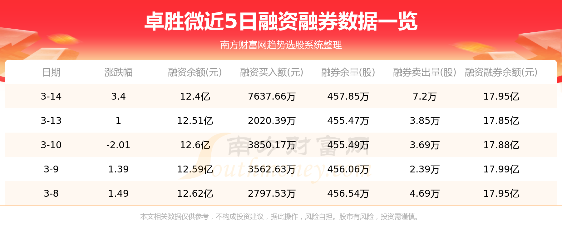 卓胜微3月14日融券信息显示,融资方面,当日融资买入7637.66万元,融资偿还8754.74万元,融资净买额-1117.08万元。融券方面,融券卖出7.2万股,融券偿还4.82万股,融券余量457.85万股,融券余额5.55亿元。融资融券余额17.95亿元。近5日融资融券数据一览见下表:
