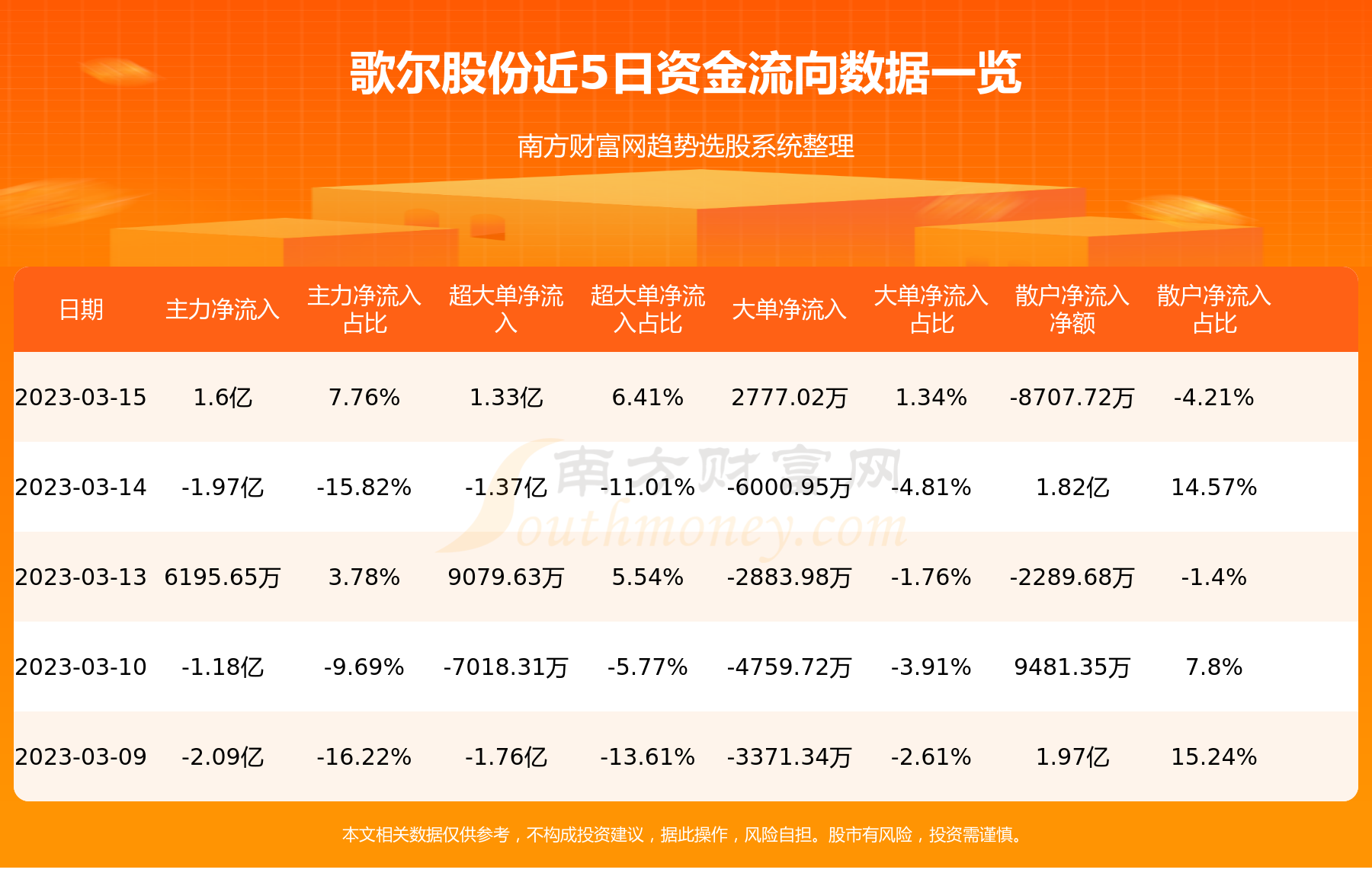 3月15日消息,歌尔股份3月15日主力净流入1.6亿元,超大单净流入1.33亿元,大单净流入2777.02万元,散户净流出8707.72万元。