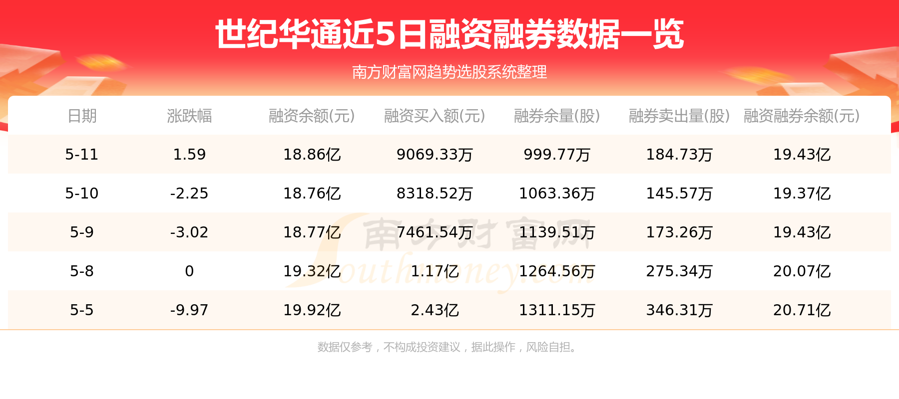 世纪华通5月11日融券信息显示,融资方面,当日融资买入9069.33万元,融资偿还8156.48万元,融资净买额912.84万元。融券方面,融券卖出184.73万股,融券偿还248.32万股,融券余量999.77万股,融券余额5738.67万元。融资融券余额19.43亿元。近5日融资融券数据一览见下表: