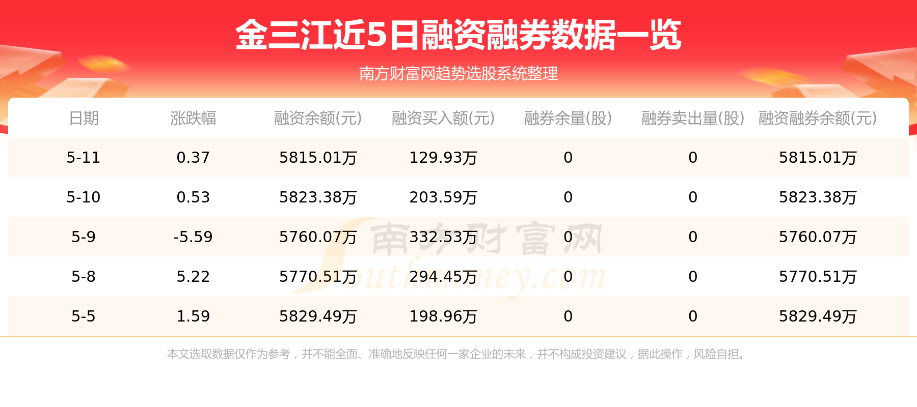 5月11日金三江融券信息显示,融资方面,当日融资买入129.93万元,融资偿还138.3万元,融资净买额-8.37万元。近5日融资融券数据一览见下表: