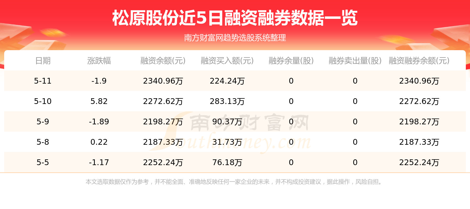 松原股份5月11日融券信息显示,融资方面,当日融资买入224.24万元,融资偿还155.91万元,融资净买额68.33万元。近5日融资融券数据一览见下表: