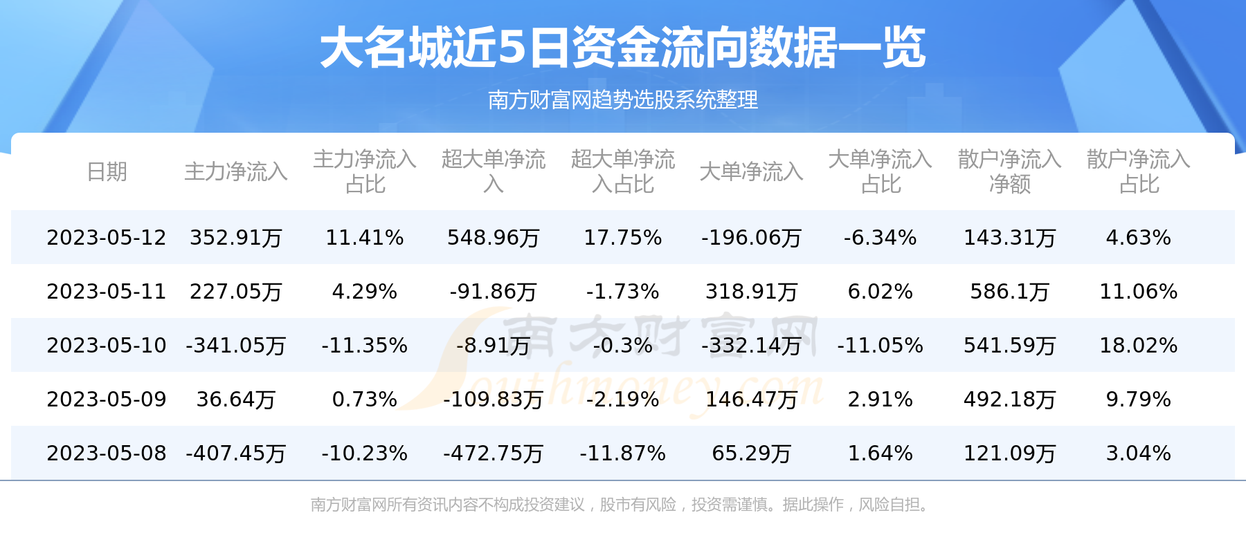 5月12日消息,大名城5月12日主力净流入352.91万元,超大单净流入548.96万元,大单净流出196.06万元,散户净流入143.31万元。