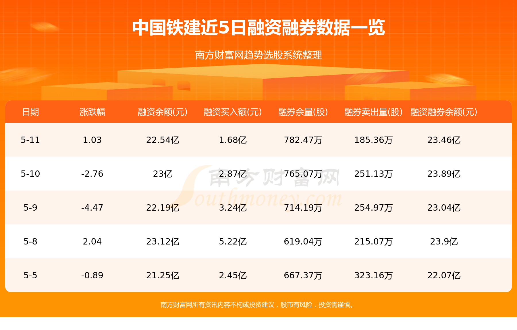 中国铁建5月11日融券信息显示,融资方面,当日融资买入1.68亿元,融资偿还2.14亿元,融资净买额-4605.82万元。融券方面,融券卖出185.36万股,融券偿还167.96万股,融券余量782.47万股,融券余额9201.9万元。融资融券余额23.46亿元。近5日融资融券数据一览见下表: