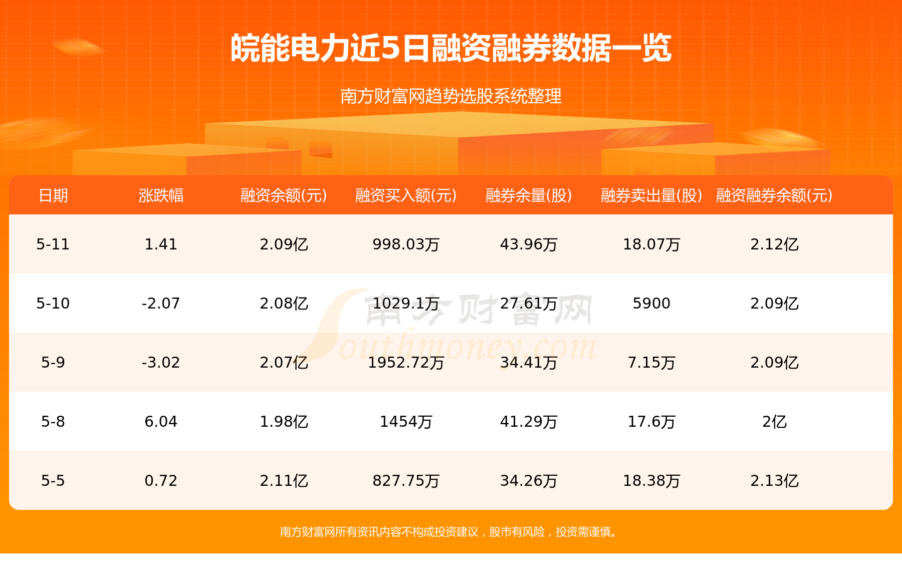 5月11日皖能电力融券信息显示,融资方面,当日融资买入998.03万元,融资偿还868.3万元,融资净买额129.73万元。融券方面,融券卖出18.07万股,融券偿还1.72万股,融券余量43.96万股,融券余额252.79万元。融资融券余额2.12亿元。近5日融资融券数据一览见下表: