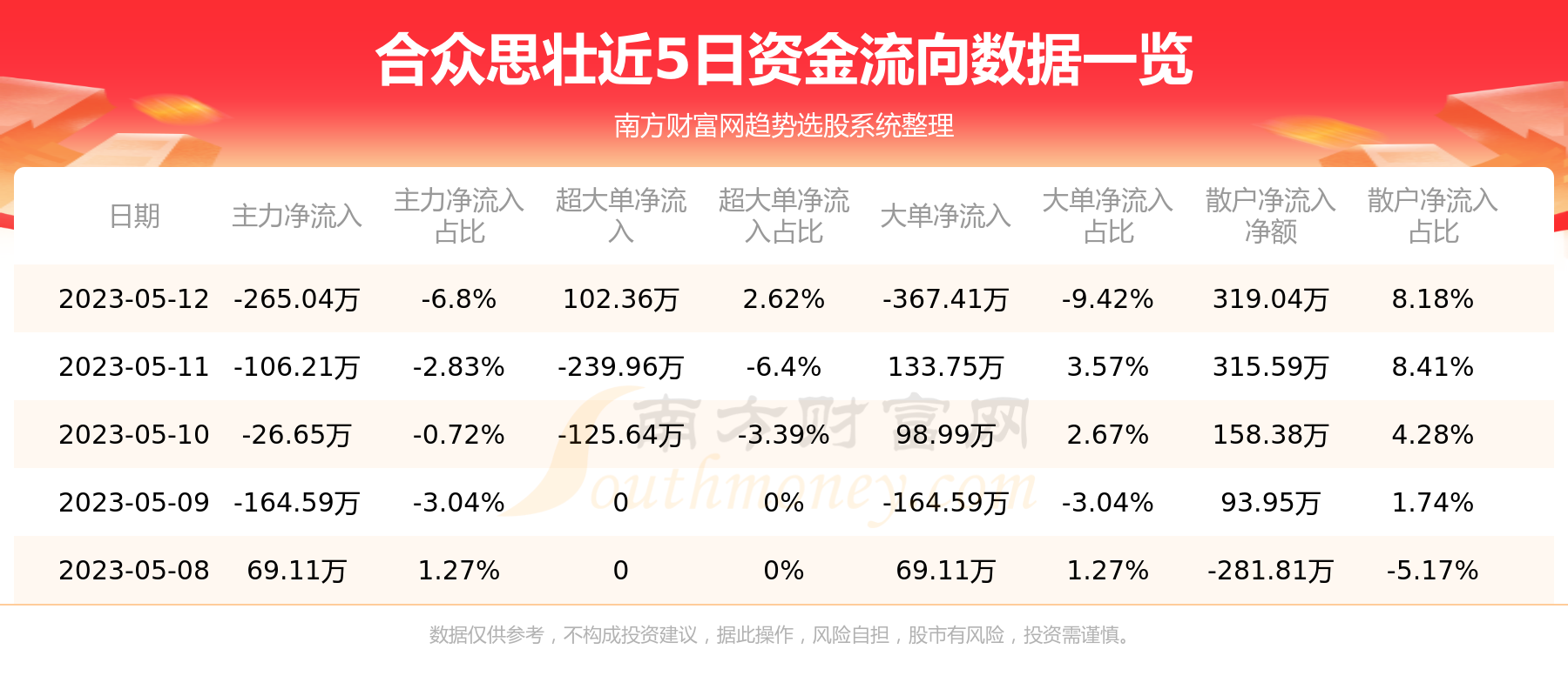 5月12日消息,合众思壮5月12日主力资金净流出265.04万元,超大单资金净流入102.36万元,大单资金净流出367.41万元,散户资金净流入319.04万元。
