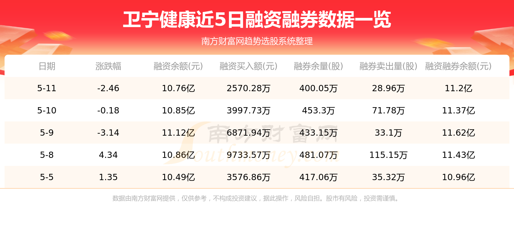 5月11日卫宁健康融券信息显示,融资方面,当日融资买入2570.28万元,融资偿还3530.87万元,融资净买额-960.6万元。融券方面,融券卖出28.96万股,融券偿还82.21万股,融券余量400.05万股,融券余额4440.51万元。融资融券余额11.2亿元。近5日融资融券数据一览见下表: