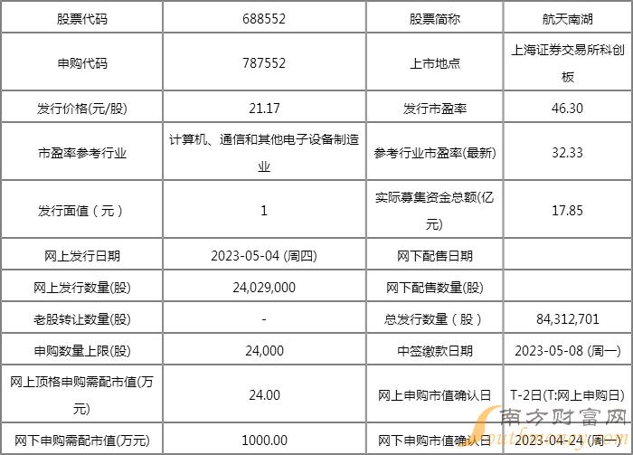航天南湖(股票代码688552,申购代码787552)将于5月4日进行网上申购,发行总数为8431.27万股,网上发行2402.9万股,申购上限2.4万股,网上顶格申购需配市值24万元。
