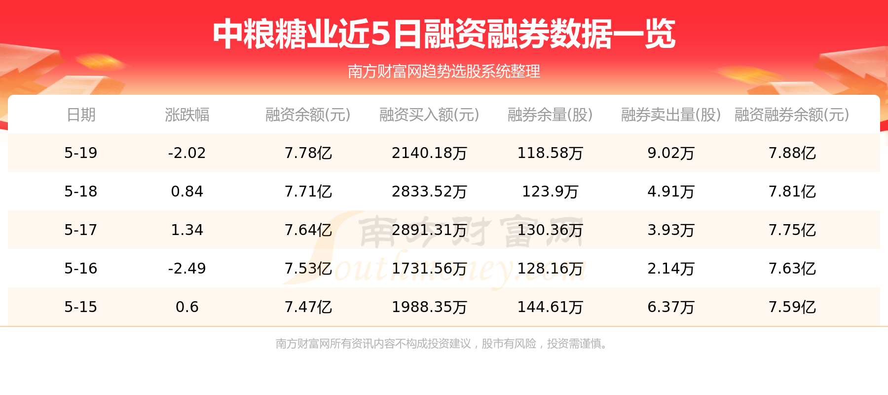 5月19日中粮糖业融券信息显示,融资方面,当日融资买入2140.18万元,融资偿还1424.22万元,融资净买额715.97万元。融券方面,融券卖出9.02万股,融券偿还14.34万股,融券余量118.58万股,融券余额978.26万元。融资融券余额7.88亿元。