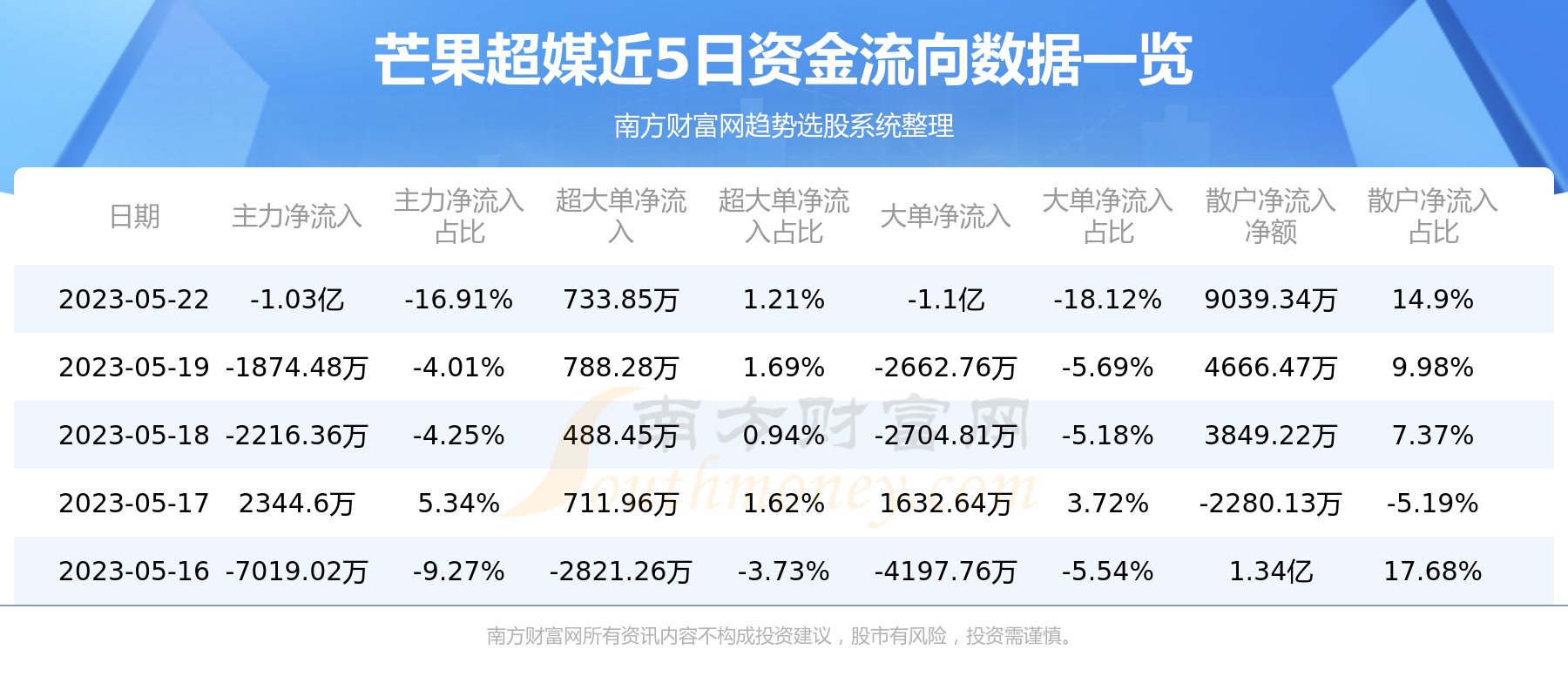 5月22日消息,芒果超媒5月22日主力资金净流出1.03亿元,超大单资金净流入733.85万元,大单资金净流出1.1亿元,散户资金净流入9039.34万元。