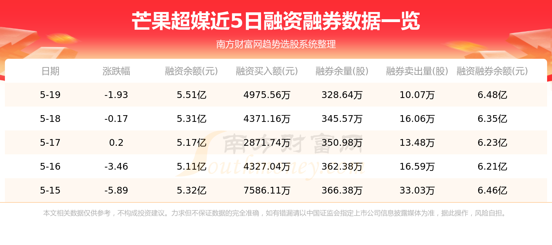 芒果超媒5月19日融券信息显示,融资方面,当日融资买入4975.56万元,融资偿还3035.04万元,融资净买额1940.52万元。融券方面,融券卖出10.07万股,融券偿还27.01万股,融券余量328.64万股,融券余额9701.33万元。融资融券余额6.48亿元。近5日融资融券数据一览见下表:
