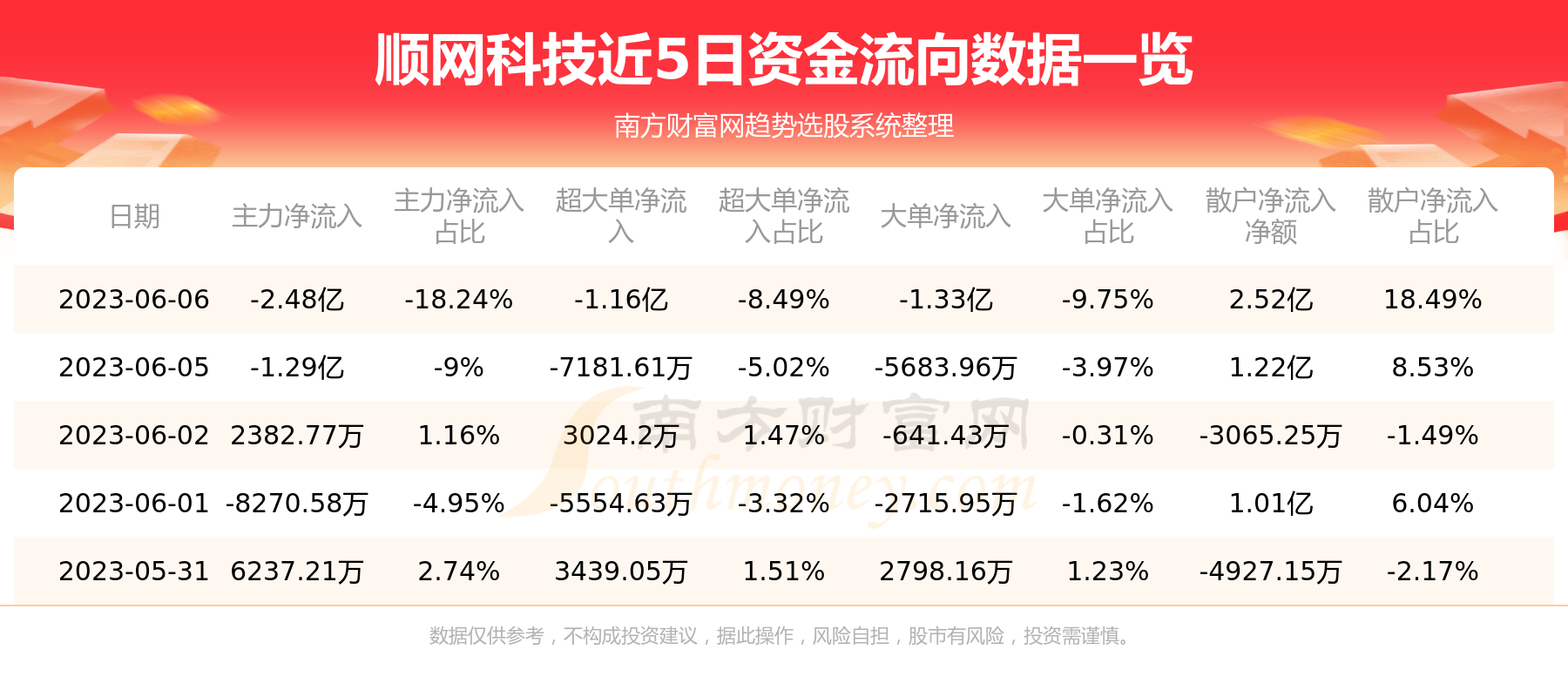 6月6日消息,顺网科技主力净流出2.48亿元,超大单净流出1.16亿元,散户净流入2.52亿元。