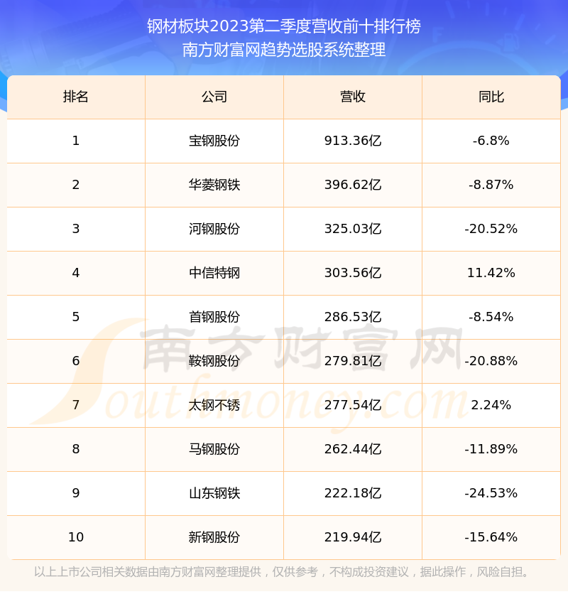 按照南方财富网趋势选股系统统计,该股所属板块为钢材板块,该板块共有27只股票,马钢股份2023第二季度营收在该板块中排名为第8名,该板块2023第二季度营收排名前十的股票如下表: