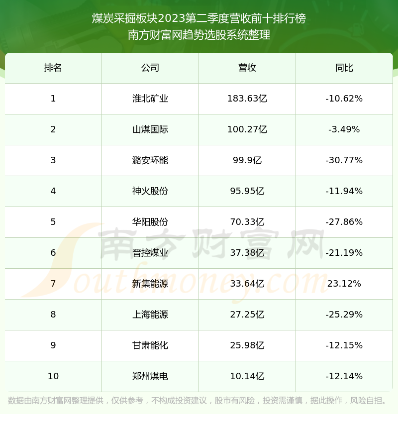 按照南方财富网趋势选股系统统计,该股所属板块为煤炭采掘板块,该板块共有11只股票,大有能源2023第二季度营收在该板块中排名为第11名,该板块2023第二季度营收排名前十的股票如下表: