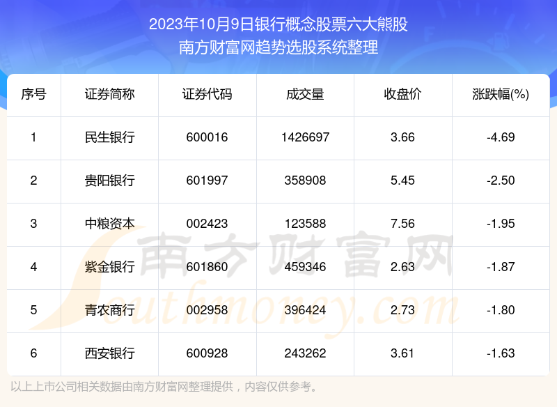 截止2023年10月9日,个股表现方面,银行概念股票当日领跌股为民生银行(600016),该股当日报收3.66,上涨-4.69%,成交量142.67万。贵阳银行(601997)以下跌-2.50%紧随其后,该股当日成交量35.89万。此外,中粮资本(002423)、紫金银行(601860)、青农商行(002958)均进入当日银行概念股票熊股之列。