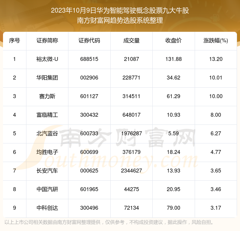 截止2023年10月9日,个股表现方面,华为智能驾驶概念股票当日领涨股为裕太微-U(688515),该股当日报收131.88,上涨13.20%,成交量2.11万。华阳集团(002906)以上涨10.01%紧随其后,该股当日成交量22.88万。此外,赛力斯(601127)、富临精工(300432)、北汽蓝谷(600733)均进入当日华为智能驾驶概念股票牛股之列。