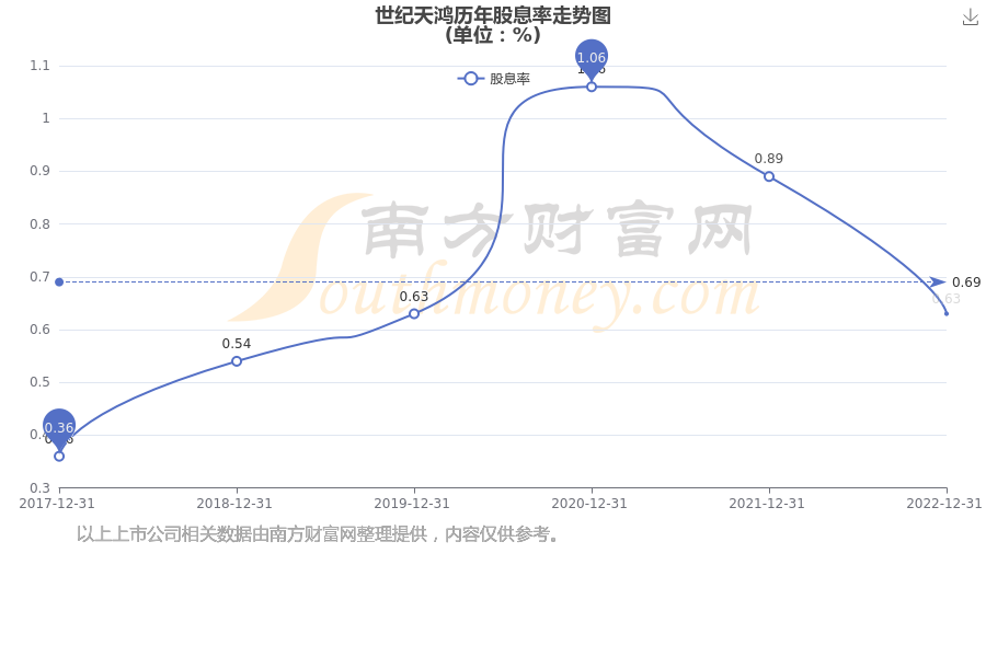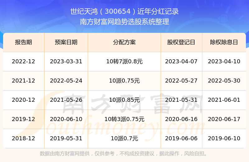 世纪天鸿最新一次公布的分红方案为10转7派0.8元。本次权益分派股权登记日为2023年4月7日,除权除息日为2023年4月10日,派息日为2023年4月10日。