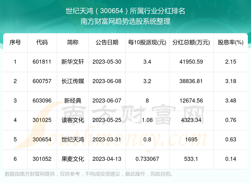 按照南方财富网趋势选股系统统计,世纪天鸿所属行业为图书行业,图书行业分红排名情况如下表: