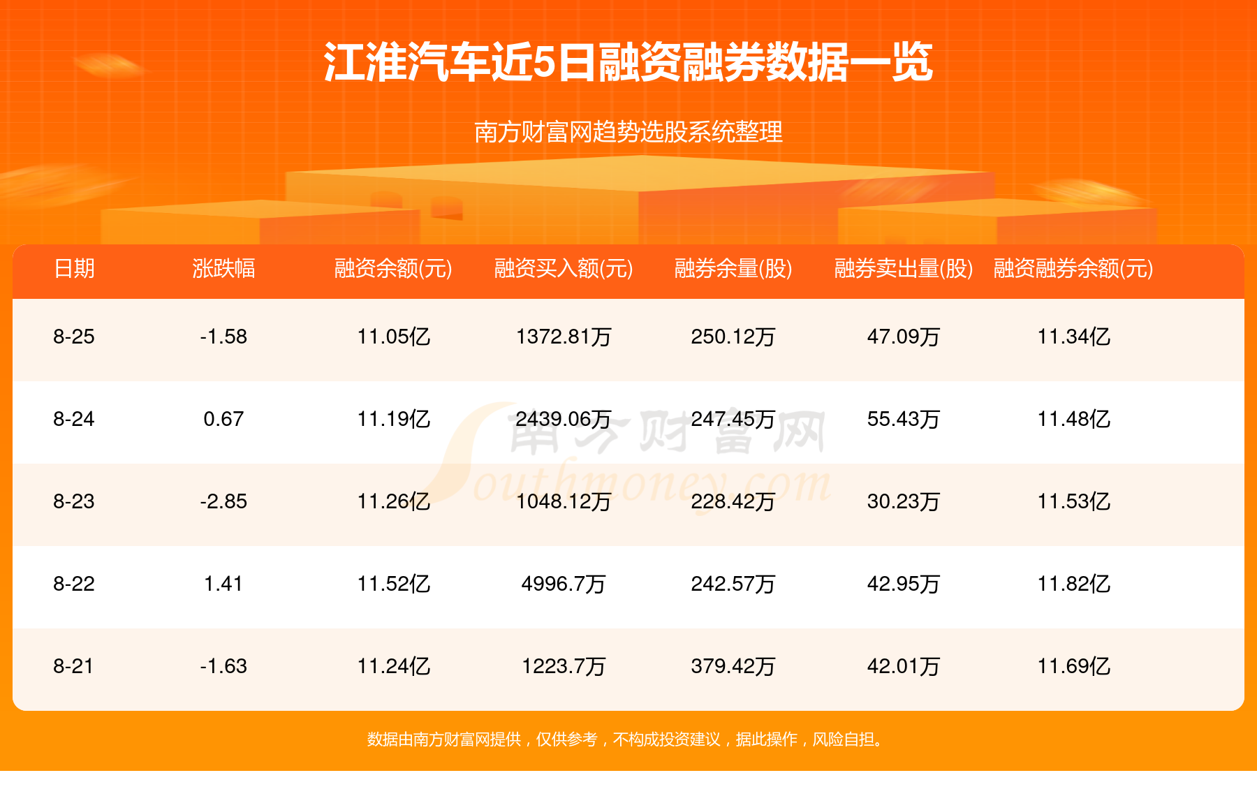 江淮汽车8月25日融券信息显示,融资方面,当日融资买入1372.81万元,融资偿还2763.19万元,融资净买额-1390.38万元。融券方面,融券卖出47.09万股,融券偿还44.42万股,融券余量250.12万股,融券余额2953.87万元。融资融券余额11.34亿元。近5日融资融券数据一览见下表: