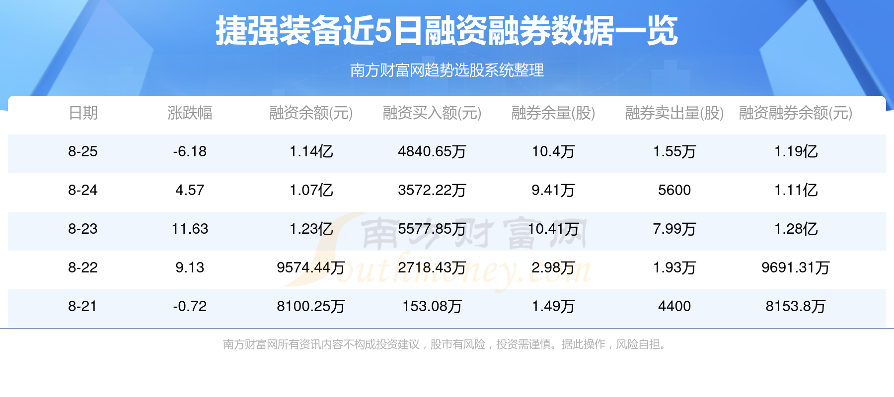 8月25日捷强装备融券信息显示,融资方面,当日融资买入4840.65万元,融资偿还4117.99万元,融资净买额722.66万元。融券方面,融券卖出1.55万股,融券偿还5600股,融券余量10.4万股,融券余额446.72万元。融资融券余额1.19亿元。近5日融资融券数据一览见下表:
