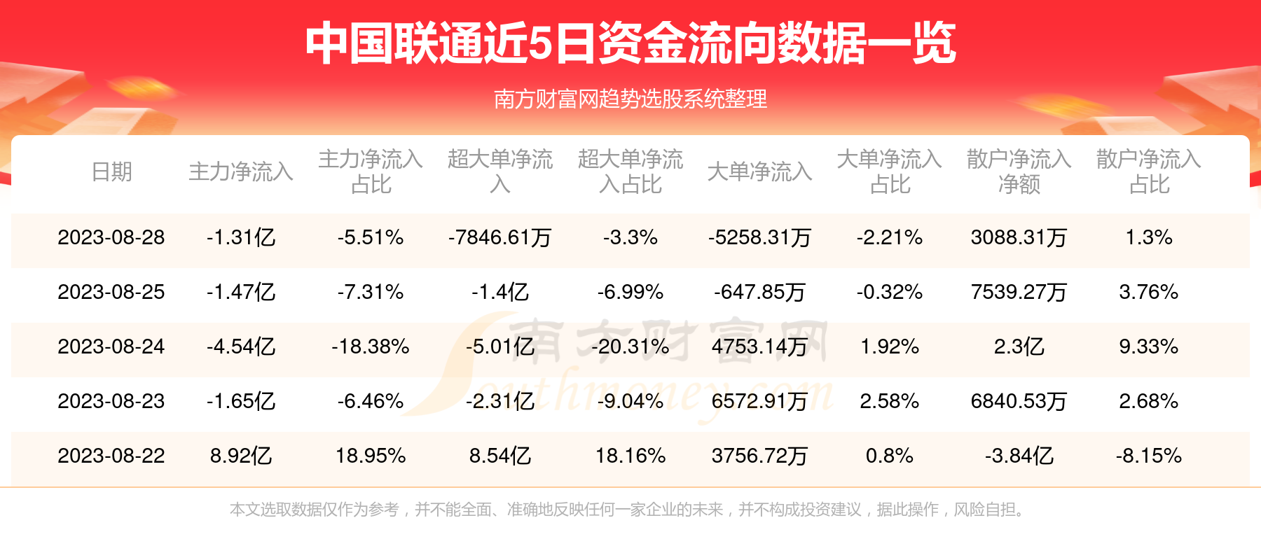 8月28日消息,中国联通主力净流出1.31亿元,超大单净流出7846.61万元,散户净流入3088.31万元。