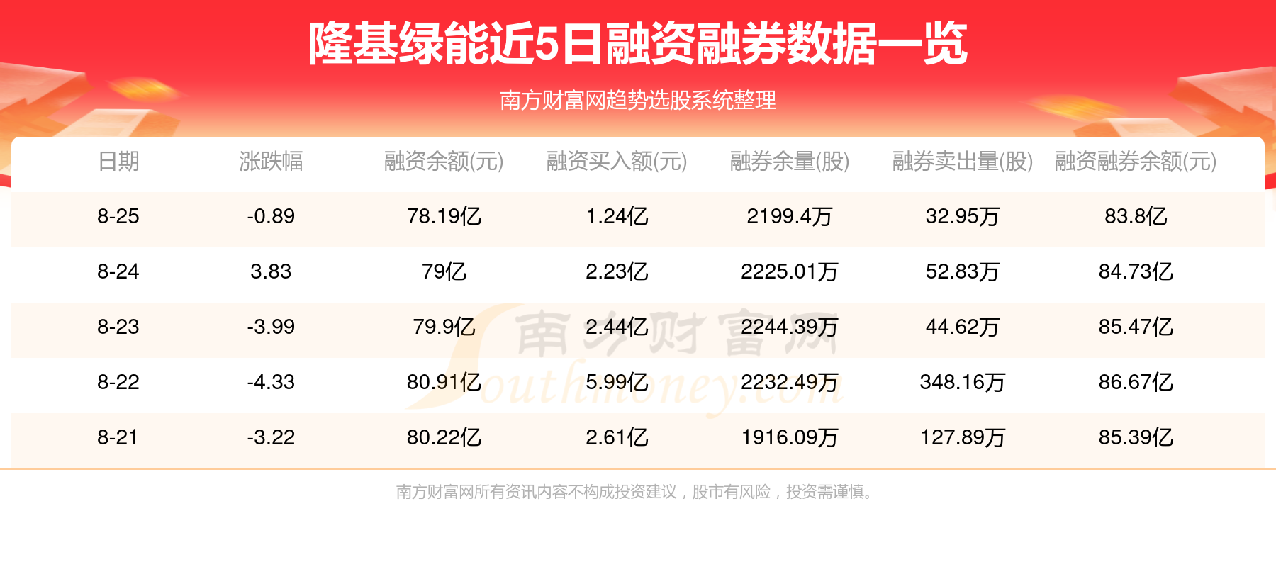 8月25日隆基绿能融券信息显示,融资方面,当日融资买入1.24亿元,融资偿还2.05亿元,融资净买额-8084.93万元。融券方面,融券卖出32.95万股,融券偿还58.56万股,融券余量2199.4万股,融券余额5.62亿元。融资融券余额83.8亿元。